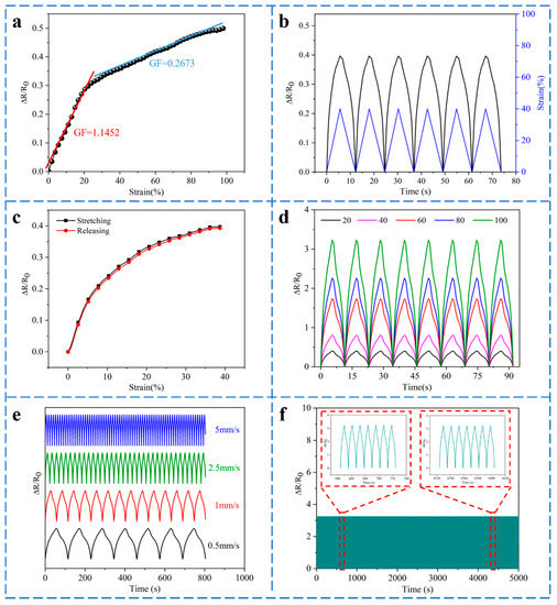 where R0 is the initial resistance, R refers to the real-time resistance of the sensor in the stretching–releasing process, and ε represents the strain applied to the sensor.