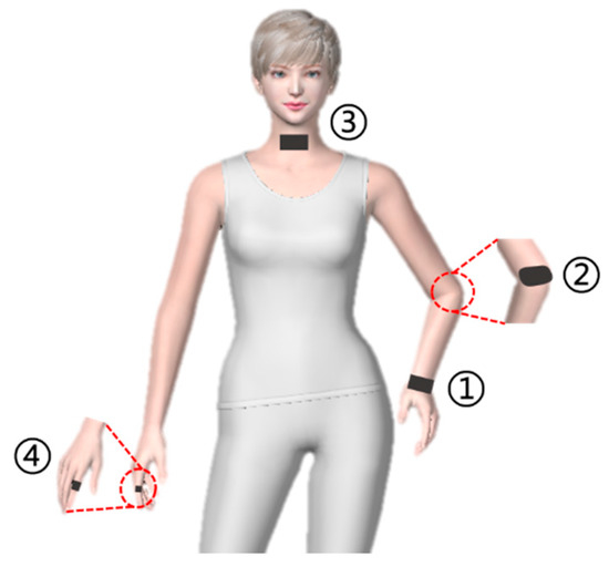 As illustrated in Figure 7, the as-designed knitted sensors under the size prediction model can be applied as a wearable device to four human body parts (wrist ①, elbow ②, throat ③, and forefinger ④) of a female volunteer to detect human movements. The horizontal and vertical sizes of different body parts are displayed in Table 3. Taking into account the effect of size changes and electrical properties, the parameters of the sensors’ conductive area based on nylon/spandex composite yarn with better elasticity (44/77dtex, = 0.36) in different body parts are revealed in Table 4. The size deviation rates of the four knitted strain sensors are within the acceptable range of 5%, verifying the correctness of the size prediction model.