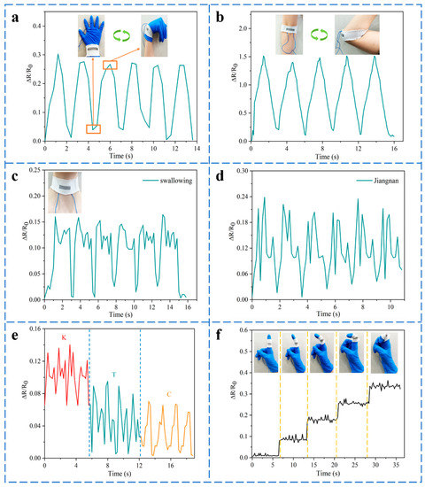 The joint bending displayed in Figure 8a,b indicates that the sensor with a wide workable strain range can detect human movements. The ∆R/R0 of the sensor is consistent with the joint motions. In addition, the strain sensor can detect subtle movements. Figure 8c indicates that the sensor was attached to the throat with the continuous swallowing of food, and the ∆R/R0 of the sensor had a relatively consistent response. Pronunciation could also be discriminated by repeatedly reading the words ‘Jiangnan’, ‘K’, ‘T’, and ‘C’, as demonstrated in Figure 8d,e. To further probe the strain sensor’s capabilities in series motion detection, it was adhered to the forefinger to collect signals. As revealed in Figure 8f, the finger bent from small to large degrees. The resistance changed synchronously with the finger deformation when it bent, indicating a good discernible ability for subtle motion. All these indicate that the as-designed knitted strain sensor exhibits a potential application prospect in smart wearable devices in the near future.