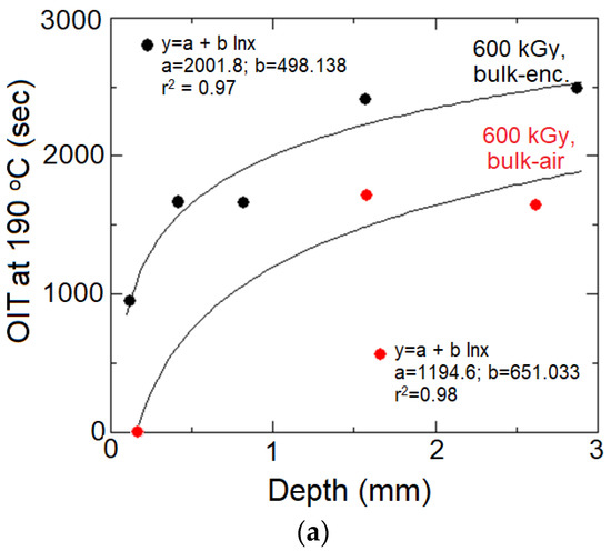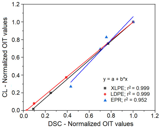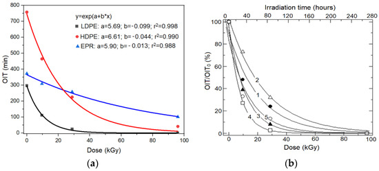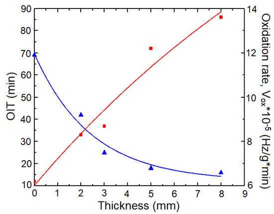 - The OIT values, which are determined at high temperatures specific to the test, correspond to the lifetime of the material under the conditions of exposure. The OIT value is directly proportional to the concentration of antioxidants in the polymeric material [2,35,45]. Therefore, OIT measurement can be used to “titrate” the antioxidant content of the sample. Thus, decreasing kinetics of OIT can be used to describe the kinetics of antioxidant depletion. Given the direct connection between OIT and material lifetime, decreasing OIT kinetics can be used to evaluate the lifetime at moderate temperatures specific to service conditions. As previously mentioned, the main problems for extrapolations are (i) the existence of a transition point (e.g., melting point of crystallinity), which can cause changes in the degradation mechanism; and (ii) the influence of temperature on the rates of different reactions. Hence, the degradation mechanism is expected to be different at higher temperatures as compared to moderate temperatures (due to the activation or deactivation of specific reactions).