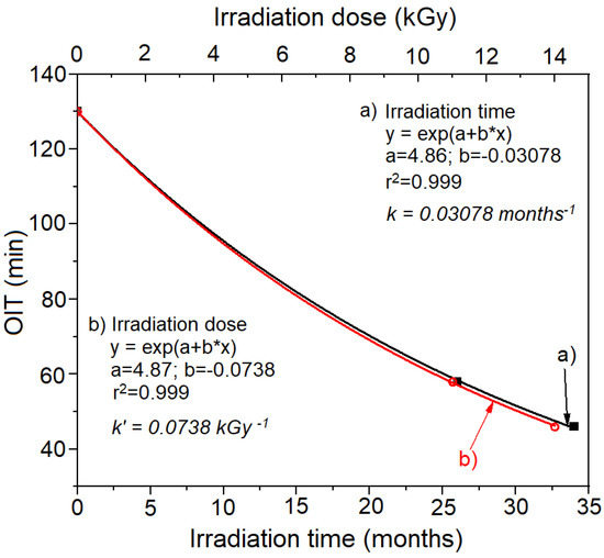 | Irradiation Time (Months) | Dose * (kGy) | OIT (min) | tx (Months)/Dx (kGy) |