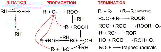 - The effect of the stress factors, irrespective of their nature, consists of molecular scissions, leading to free radicals. These species react rapidly with the surrounding oxygen in air and trigger oxidation chain reactions (Scheme 1), leading to material deterioration and implicitly shortening their lifetime. In the case of ethylene polymers, lifetime diminution is caused by the progressive consumption of antioxidants.The initiation of degradation (produced by breaking of labile chemical bonds of the polymer) occurs by the action of different stress factors (high temperatures, light, radiation, electric field, etc.). The formed free radicals are subsequently trapped by oxygen, and the degradation propagates as chain reactions of free radicals thus formed. On average, each free radical formed subsequently involves the reaction of five oxygen molecules [46]. The second component of propagation consists of reactions of hydroperoxides.Even in the absence of oxygen, stress factors can induce free radicals, producing polymer degradation by scission and eventual crosslinking. The subsequent air exposure of such material results in its oxidation due to the reactions of the trapped free radicals [47].