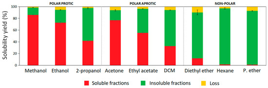Recovered hardwood kraft lignin from an industrial black liquor can be considered as a mixture of different lignin polymeric fractions. In this work, the one-step fractionation process was studied using nine organic solvents of different chemical nature to assess their ability to obtain more uniform lignin fractions with specific properties. The solvents were classified according to their chemical nature in addition to their dipole interactions (polar forces) and hydrogen bonding capacity based on the Hansen solubility parameter [21]. Methanol (δP = 12.3; δH = 22.3), ethanol (δP = 8.8; δH = 19.4), and 2-propanol (δP = 6.1; δH = 16.4) were used as polar protic solvents, while acetone (δP = 10.4; δH = 7.0), ethyl acetate (δP = 5.3; δH = 7.2), and dichloromethane (δP = 6.3; δH = 6.1) were selected as polar aprotic solvents. In addition, three different non-polar organic solvents such as diethyl ether (δP = 2.9; δH = 5.1), hexane (δP = 0; δH = 0), and petroleum ether (δP = 0; δH = 0) were used for kraft lignin fractionation. Aside from the chemistry of organic solvents, other aspects associated with their boiling points and environmental impact were also taken into consideration. Hence, from the selected solvents, three alcohols, acetone, and ethyl acetate were grouped as recommended solvents for chemical processes and suitable for industrial-scale implementation, while dichloromethane, diethyl ether, hexane, and petroleum ether were considered hazardous solvents which present strong restrictions for scale-up [22]. However, these last solvents were also included in the lab-scale study with the aim of gaining more insight into their influence on hardwood kraft lignin properties during fractionation. The yields of soluble and insoluble fractions from the one-step fractionation processes are presented in Figure 1. The solubility yields of HKL were linearly correlated to the polarity (δP) of the solvents (R = 0.93) (Figure S1). High–medium solubility was observed in polar protic and aprotic solvents, which ranged from 40 to 86%, and from 30 to 77%, respectively. In case of alcohols, their hydrogen bonding capacity and polarity showed a significant influence on the fractionation yields. As can be observed, the solubility yield of kraft lignin in methanol, ethanol, and 2-propanol decreased as the number of carbons in the side chain increased, because longer aliphatic chains in alcohols reduce the polarity and the hydrogen bonding capacity of the alcohols [13,23]. Aprotic solvents such as acetone, ethyl acetate, and dichloromethane have lower hydrogen bonding capacity than alcohols; however, their polarity allowed the partial solubilization of HKL in the following order: acetone > ethyl acetate > dichloromethane. The ability of polar protic and aprotic solvents to solubilize high yield lignin fractions was previously reported by other authors [13]. With regard to non-polar solvents, crude HKL was insoluble in hexane and petroleum ether; however, diethyl ether was able to slightly solubilize around 11% of HKL, due to its cohesive energy related to dipole interactions and hydrogen bonding capacity. Wang et al. (2010) [24] fractionated Eucalyptus kraft lignin by sequential organic solvent extraction and evidenced an even lower solubilization yield (1.6%) of lignin in diethyl ether, demonstrating different behavior of lignin polymer even though they were from the same source. Other authors tested the solubility of lignin from bagasse isolated by acetosolv treatment in different organic solvents; the resulting isolated lignin was totally insoluble in diethyl ether. Therefore, although the trend of lignin to solubilize in organic solvents might be generalized, the solubility yield is highly dependent on the type of lignin and its origin [25].