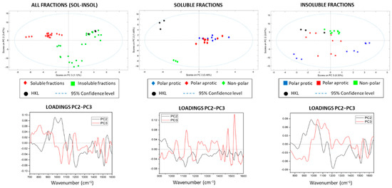 FTIR analysis, scores, and loadings of all samples, and in the soluble and insoluble fractions.
