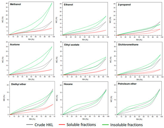 Lignin has been always considered a hydrophobic compound when compared with the other polymers from lignocellulosic biomass such as hemicellulose and cellulose. However, lignin polymer contains a wide variety of functional groups able to interact with the vapor water molecules of the environment. Nevertheless, the water sorption–desorption behavior of lignin compound is still an unknown topic. This research work investigated the effect of the fractionation process on the hygroscopic properties of the resulting lignin fractions. Equilibrium moisture content of kraft lignin fractions during a sorption–desorption cycle calculated by saturated salt solution method is presented in Figure 4. The maximum moisture content in crude HKL at saturated conditions was around 18%. However, very different sorption–desorption patterns were observed for soluble and insoluble fractions. Soluble fractions reached up to 5–7% of moisture content at 95% relative humidity, while insoluble fractions showed higher water affinity, especially in the case where polar protic and aprotic solvents such as methanol and acetone were used for refining lignin. It was a clear trend regarding the insoluble fractions originating from organic protic and aprotic solvents; lower polarity of the solvent led to a less hygroscopic lignin fraction. It could be related to the higher contribution of carbohydrate derivatives of these fractions observed in the analytical pyrolysis, as the water absorption capacity of the insoluble fractions from polar solvent was proportional to the furan-related compounds found in the pyrograms. This indicates that higher sorption–desorption isotherms could be related to the high amounts of polysaccharides present in these fractions since hemicelluloses are the constituents in the cell wall of the plant with the highest affinity to water [41]. However, both the shape of the isotherm and the water absorption capacity of insoluble lignin fractions from apolar solvents were similar to crude HKL. As was reported in previous studies, lignin polymer exhibits sigmoid shape isotherms (type II) which are also common in wood and wood-derived compounds (macroporous materials) [41,42]. This type of isotherm is the result of the monolayer–multilayer adsorption mechanism of the water vapor molecules into the microstructure of the material [43] and are concave at low RH%, approximately linear in the intermediate region, and convex at high RH%. This pattern was observed in crude HKL and insoluble fractions, except in the insoluble fraction from 2-propanol, while soluble fractions obtained from the most polar protic and aprotic solvents showed almost linear shape isotherms with negligible hysteresis phenomenon. Hysteresis is a result of the difference between equilibrium moisture content in sorption and desorption at the same relative humidity. As can be observed, insoluble fractions evidenced higher hysteresis than soluble fractions indicating their lower capacity to release the adsorbed water during a desorption process. According to previously reported studies, the hygroscopic property of materials is related to the availability of sorption sites to bond with the water vapor molecules. In the case of lignin, hydroxyl and carboxylic groups were recently recognized as active water sorption sites [44,45]. Several authors reported that lignins with lower molecular weight contained higher hydroxyl and carboxylic groups in their chemical structure [12,14,46]. Additionally, our results proved that the soluble fractions showed higher total phenolic content than insoluble fractions (Table 4); however, they exhibited less affinity to water vapor. Therefore, based on our results and according to literature, the authors support the theory that the hygroscopicity and hysteresis phenomenon of lignin polymer is influenced by the chemical structure, but it is especially dominated by the microstructure of the polymer, which plays an essential role in hampering or favoring the availability of these functional groups and their interaction with water vapor molecules.
