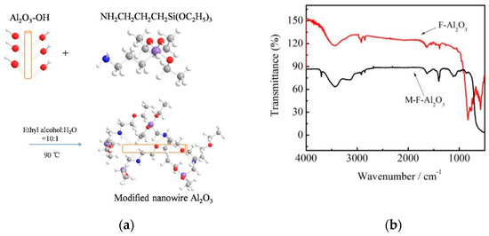 (a) Schematic of modified Al2O3 by KH550, (b) FT-IR curves of Al2O3 fiber and modified Al2O3 fiber.
