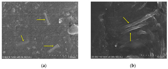 The microstructures of R-Al2O3/LDPE and A-Al2O3/LDPE composites were observed by SEM. The samples were quenched in liquid nitrogen before the observation. The cross-section SEM images of R-Al2O3/LDPE and A-Al2O3/LDPE composites are shown in Figure 3. As shown in Figure 3a, Al2O3 fibers are randomly dispersing in LDPE. Figure 3b reveals that Al2O3 fibers are arranging almost parallel to the surface of LDPE composites. It was proven that the rearrangement of Al2O3 fibers could form a neat array structure under the electric field for a long time.