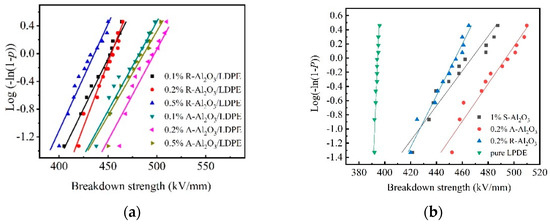 The breakdown strength of Al2O3/LDPE composites with the thickness of 50 ± 5 μm (a) different content of R-Al2O3/LDPE and A-Al2O3/LDPE; (b) pure LPDE and three different types of Al2O3/LDPE composites.