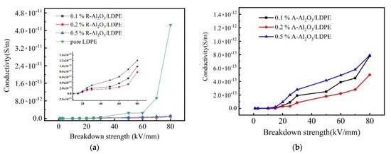 DC conductivity of (a) R−Al2O3/LDPE and pure LDPE, (b) A-Al2O3/LDPE.