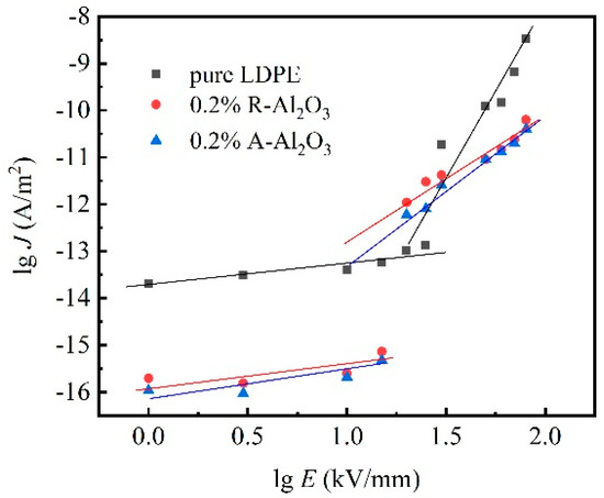 Figure 6 shows the electrical strength dependency on current densities of 0.2% R-Al2O3, 0.2% A-Al2O3 and pure LDPE composites. As shown in Figure 6, the electric field thresholds which linked the Ohmic region and non-Ohmic region are decreasing as Al2O3 fiber filled. Based on the Space Limited Current (SCLC) theory [38,39], the injecting charge has nearly been trapped in the Ohmic region. The injecting charge would not contribute to the current increasing. For the non-Ohmic region, the trapping charge in the composite will be detrapping, and the injecting charges will increase the current density. As the electric field increased, the injecting charge amount in the pure LDPE increases and the electron transport is more active.