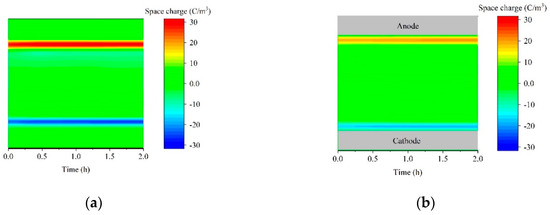 Figure 7 shows the injecting and decaying effect of the dynamics space charge of A-Al2O3/LDPE. Figure 7a–d is the space charge profiles of A-Al2O3/LDPE composites (0, 0.1%, 0.2%, and 0.5%) under 30 kV/mm stressing for 2 h, respectively. It can be seen that the charge accumulated in the electrode. The accumulation of space charge has been increased as time passes. The amount of charge in the A-Al2O3/LDPE composite is smaller than that of pure LDPE. This indicates that the array arrangement can effectively inhibit the formation of heterogeneous charges, resulting in a reduction in the number of charges inside the material. Especially, the A-Al2O3/LDPE composite with 0.2% A-Al2O3 loading, which has just a little charge.