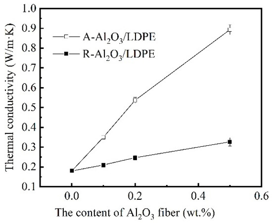 Figure 8 shows the thermal conductivity of the composites containing various amounts of Al2O3 fiber. It can be seen that the thermal conductivity of composites increased significantly with the content of Al2O3 fiber increasing. The thermal conductivity of LDPE with 0.5 wt% A-Al2O3 loading is 0.85 W/m·K, which is 3 times higher than that of pure LDPE (0.22 W/m·K). The thermal conductivities of the R-Al2O3/LDPE composite are lower than that of the A-Al2O3/LDPE composite.