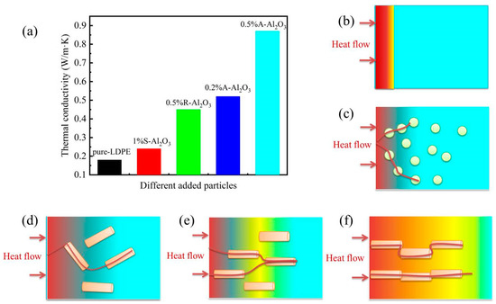 The thermal conductivity of Al2O3/LDPE with different particles and the heat flow (a) the diagram of heat flow (b) pure LDPE, (c) S-Al2O3/LDPE (d) R-Al2O3/LDPE (e) 0.1%A-Al2O3/LDPE (f) 0.1%A-Al2O3/LDPE composite.