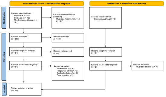 The Preferred Reporting Items for Systematic Reviews and Meta-Analyses (PRISMA) reporting guideline was followed to conduct the study [30] (Appendix B). Study selection procedures are illustrated in Figure 1. Searches of three primary electronic databases identified 618 unique abstracts, titles, or both identified as original publications. Of the total, 54 proved potentially relevant for full-text review. Of these, 31 articles on the management of ESD-induced ulcers via endoscopic closure (hemoclips, endoclips, endoloop + endoclips, detachable snare + clips, OTSC + through-the-scope clips [TTSC], overstitch suturing, handsewn suturing) [31,32,33,34,35,36,37,38,39,40,41,42], tissue shielding methods (PGA sheets-based) [10,43,44,45,46,47,48,49], and hemostatic powder/gel spray [18,19,50,51,52,53,54,55,56,57,58], matched the selection criteria and were included in the systematic review. The key characteristics of each included study appear in Table 1. Among these studies, 23 reported data relevant to procedure time for anti-bleeding techniques. Seventeen studies were performed in Japan, and the remainder were performed in Korea, China, France, the United States, the United Kingdom, and Malaysia. There were six RCTs, and all but five studies were single-centered. These studies were all included in the non-comparative trial synthesis. Of the 31 studies, 15 were excluded because they only included single-arm trials; finally, 16 studies were included in the comparative trial synthesis, including pair-wise and network meta-analysis.