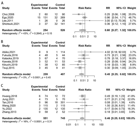 The pooled RR across studies comparing tissue shielding with control groups was 0.45 (95% CI 0.25–0.82), with a negligible level of heterogeneity (I2 = 0%, p = 0.45), which indicates tissue shielding significantly reduces the risk of delayed bleeding in post-ESD patients. Post-ESD management using hemostatic spray also showed significant efficacy in reducing delayed bleeding risk (RR 0.46, 95% CI 0.25–0.83; I2 = 16%, p = 0.31). However, in studies comparing the efficacy of prevention of delayed bleeding using endoscopic closure (RR 0.60, 95% CI 0.27–1.32; I2 = 43%, p = 0.150) with control groups, no statistically significant difference was found (Figure 2).