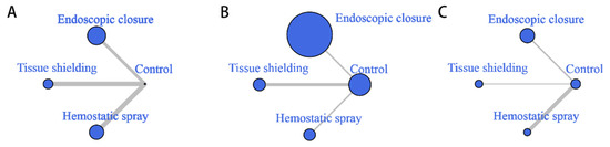 All 16 studies included in the network meta-analysis were two-armed; among these, four, six, and six studies, respectively, compared the delayed bleeding rates between the group that received post-ESD endoscopic closure, tissue shielding, and hemostatic spray, and the group treated with conventional coagulation and/or clipping of the visible vessels. Thus, a network was created among the nodes of the three categorized endoscopic approaches (endoscopic closure, tissue shielding method, and hemostatic spray) with a control group node (Figure 3A). Overall, 2742 lesions were randomly assigned to one of the three endoscopic approaches for the prevention of delayed bleeding or the conventional treatment, and were included in the network meta-analysis.