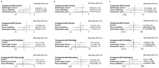 The efficacy of different endoscopic approaches for the prevention of delayed bleeding after gastric ESD, according to network meta-analysis: (A) in patients overall; (B) in high-risk patients; (C) in low-risk patients.