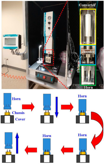 Photo of an ultrasonic plastic welding machine used in this study and schematic illustration of UW processes.