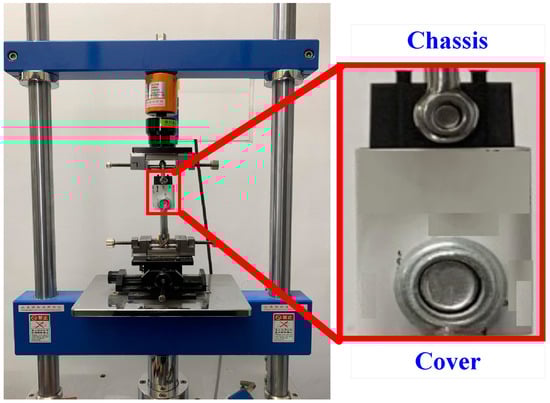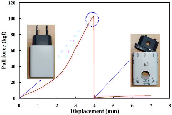 Both the cover and chassis of a 3C power case were fabricated by plastic injection molding via polycarbonate (PC) [24] using a plastic injection molding machine (KT2S, Kinki Inc., Taipei city, Taiwan) [25]. The process parameters involve injection pressure of 18 MPa, injection speed of 80 mm/s, and cooling time of 10 s. The length, width, and height of the cover are 42.8 mm, 26 mm, and 51.8 mm, respectively. The length, width, and height of the chassis are 40.6 mm, 23.8 mm, and 39 mm, respectively. The thickness of both the cover and chassis is about 2 mm. Figure 3 shows the photo of an ultrasonic plastic welding machine (UWM 2000X, Texsonic Inc., Furth, Germany) used in this study and schematic illustration of UW processes. After UW, the weld strength of the power case was investigated using a tensile test apparatus (1220WS. Se testststems Inc., Taipei city, Taiwan). Figure 4 shows the situation of the tensile testing. Tensile test speed of 50 mm/min was selected for the investigation of strain rate. The strain rate is about 900 S−1 based on the stress to strain curve.