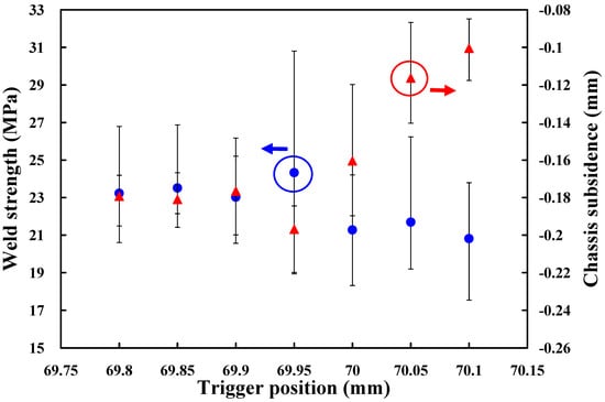 Based on the above results, the amplitude of 65%, i.e., amplitude of 40.3 µm, weld pressure of 125 kPa, and hold time of 0.5 s are fixed. To investigate the effect of trigger position on the weld strength of a power case, seven different trigger positions, i.e., 69.8 mm, 69.85 mm, 69.9 mm, 69.95 mm, 70 mm, 70.05 mm, and 70.1 mm are performed in the following experiments. Figure 8 shows the effects of the different trigger positions on weld strength and chassis subsidence. According to both weld strength and chassis subsidence, it was found that the trigger position of 69.95 mm seems to be the optimum parameter. Thus, the trigger position of 69.95 mm is determined as level 2 of control factor 3. The trigger positions of 69.9 mm and 70 mm are determined as levels 1 and 3 of control factor 3, respectively.