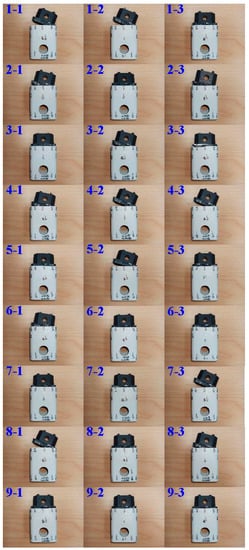 To study the effects of process parameters of UW on the weld strength of the injection molded PC parts, the Taguchi methods [26] with Latin square 9 orthogonal design were used to determine the signal-to-noise (S/N) ratio in this study. It is well known that the Taguchi methods have three different kinds of quality characteristics, i.e., the-nominal-the-best, the-larger-the-better, and the-smaller-the-better [27]. Equations (1)–(3) represent the-larger-the-better, the-smaller-the-better, and the-nominal-the-best, respectively. Three different S/N quality characteristic formulations are shown in the following equations. To investigate the optimum process parameters for fabricating a power case with the highest weld strength, the orthogonal array (OA) [28] was employed in this study since it is suitable for the four process control factors with three levels. In general, analysis of variance (ANOVA) is frequently used to compare the difference between the means of the groups. The ANOVA table involves various statistics, including sum of square, degree of freedom, p-value, as well as contribution ratio of each control factor. Finally, the confirmation experiment is performed to validate the optimum process parameters of UW obtained in this study.