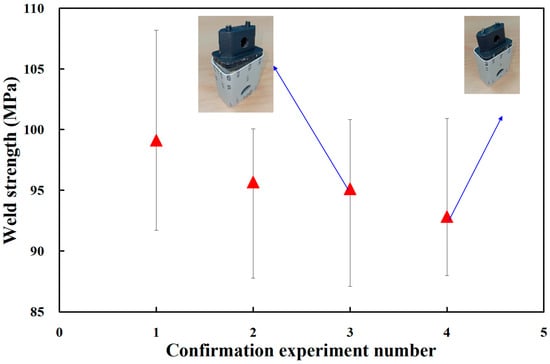 To verify the optimum UW process parameters obtained in this study, three sets of non-optimal process parameters for UW were employed randomly in the confirmation experiment. Figure 13 shows the results of the confirmation experiments. Table 5 shows the results of verifying the optimum process parameters. As can be seen, the weld strengths of the four plastic power cases are approximately 18.85 MPa, 18.19 MPa, 18.09 MPa, and 17.66 MPa, respectively. Results revealed that the average weld strength of a plastic power case obtained by optimum UW process parameters is significantly higher than the average weld strength of a plastic power case obtained by general process parameters of UW. Based on the results described above, the remarkable findings of this study are very practical and provide the greatest application potential in the 3C industry. In this study, the material of the power case used was PC. A wide range of thermoplastic materials [34], including acrylonitrile butadiene styrene (ABS) [35] or PC/ABS [36] can also be used to joint a 3C power case. Laser welding [37,38] can also be employed for jointing 3C power cases because it is a high speed, precise, and clean manufacturing process. Unfortunately, this study did not investigate the tensile fracture mechanisms of welded parts fabricated with different UW process parameters. Therefore, scanning electron microscopy can be used to study the tensile fracture mechanism and surface morphology of the tensile fracture surface. These issues are currently being investigated and the results will be presented in a later study.