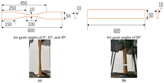 Dimensions of the samples: (a) sample dimension type for grain angles of 0°, 10°, or 45°; (b) sample dimension type for a grain angle of 90°.