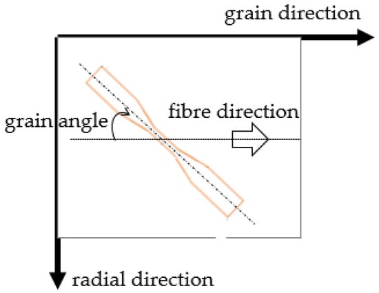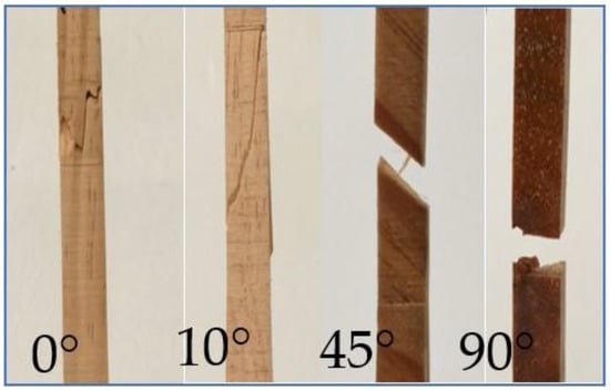 The fibre-directed tensile failure mode was classified according to its shape []. The failure mode linked strongly with its grain angle, as shown in Figure 8.