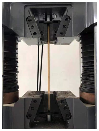 The tests were implemented on a universal testing machine (Zwick Roell-Z100, ZwickRoell LP, Kennesaw, GA, USA, capacity 100 kN) according to ASTM D143–09 [] with relative humidity and temperatures in the range of 55–70% and 15–25 °C, respectively. The samples were carefully clamped at either end (Figure 3). Tensile testing was performed at a constant loading rate using displacement-control and discontinued when rupture failure was observed in the load-deflection curves. An increase in length over the entire sample was measured via the testing machine control signal data. Deformations were measured from the point at which tensile stress first appeared. The distance between the two grips when tension first developed was also measured as the original distance. A computer connected to a data acquisition board was used to store and analyse the data.