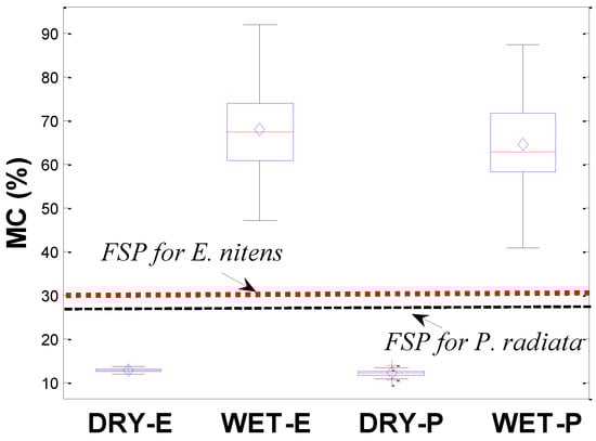 Figure 4 shows a boxplot of MCs for E. nitens samples in the present study compared with the data from the corresponding P. radiata samples. In the present study for E. nitens, the MC varied between 11.7% and 13.5% for low MC samples and between 46.9% and 91.7% for high MC samples, with mean (COV) values of 12.7% (2.8%) and 67.7% (13.6%), respectively. P. radiata had a similar MC range to E. nitens samples, with the mean MC value of wet P. radiata samples being 4.8% lower than the corresponding wet E. nitens timber (Figure 4).