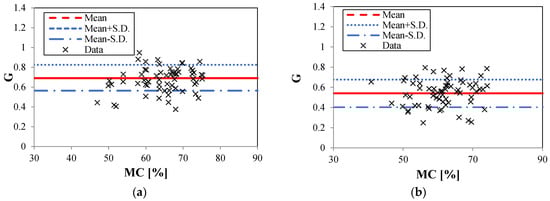 Moisture reduction factor (G) versus MC for Group I samples: (a) E. nitens; (b) P. radiata. S.D. denotes standard deviations.