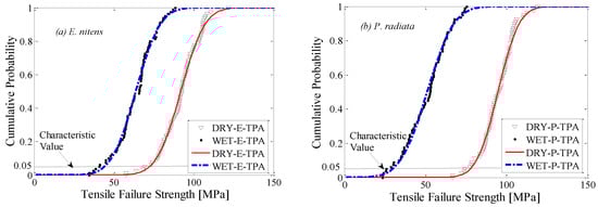 Both the mean moisture contents of this research are far above the FSP. The Wood Handbook and previous studies have found that there are no fundamental changes in failure strength for an MC above the FSP [,,]. Therefore, the 4.8% difference in MC does not significantly influence the values of the failure strengths studied. This indicates that the measured failure strengths from both P. radiata and E. nitens samples are comparable. Wet P. radiata samples were lower in failure strength compared to the corresponding E. nitens samples (Figure 5). This does not mean that the moisture content does not affect the failure strength of E. nitens. It simply means that the tensile strength of E. nitens is less sensitive to moisture content than that of P. radiata.
