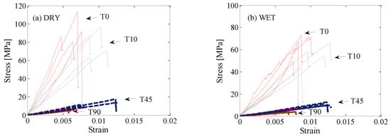 The linear range of stress–strain curves for the wet samples ended at somewhat lower stress values compared to the linear range of the corresponding dry samples. More ductility in the tensile behaviour was found in the wet samples (Figure 7), since moisture makes the wood fibres’ ductility increase []. The experimental data in the research showed that the high moisture content (wet) samples exhibited a considerably larger strain at a lower failure strength, and plus, the grain angle had a greater influence on the tensile behaviour of E. nitens than the moisture content.
