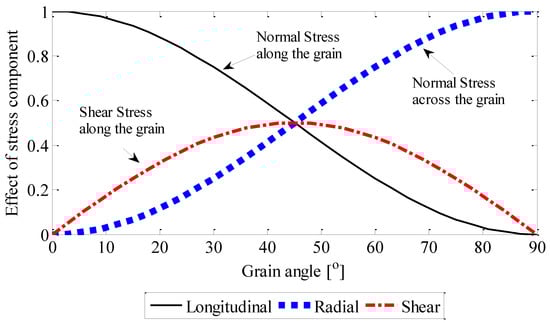 where and are the absolute values of the longitudinal and radial normal stresses (MPa), respectively. is the absolute value of the shear stress (MPa) along the grain direction in the L–R plane. is the grain angle, and is the absolute value of the stress (MPa) in the load direction.