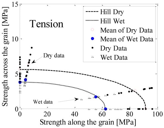 The tensile failure envelopes in the longitudinal and radial planes for E. nitens timber in dry (MC = 12%) and wet (MC > FSP) states compared with the mean values of experimental data (the circles). The failure envelopes were determined based on Hill criteria [] using the values of the parameters presented in Table 4.