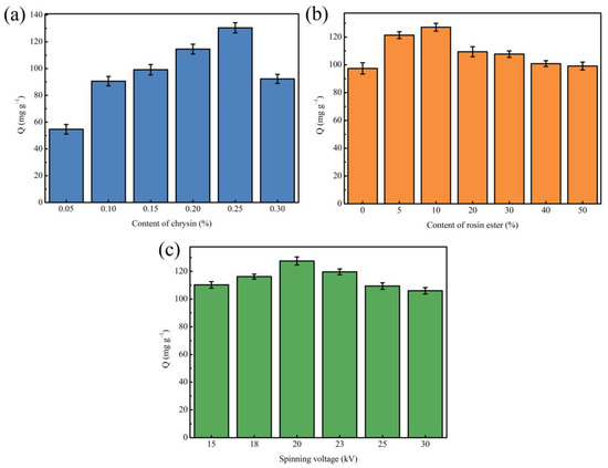 (a) Effect of different content of chrysin on the adsorption capacity of MINM; (b) effect of different rosin ester content on the adsorption capacity of MINM; (c) effect of different spinning voltage on the adsorption capacity of MINM.