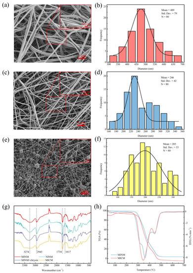 (a) SEM micrographs of MINM; (b) diameter distribution of MINM; (c) SEM micrographs of NINM; (d) diameter distribution of NINM; (e) SEM micrographs of MICM; (f) diameter distribution of MICM; (g) FT-IR spectra of the MINM, NINM, unwashed MINM, and MICM; (h) TGA and DTG curves of MINM and MICM.