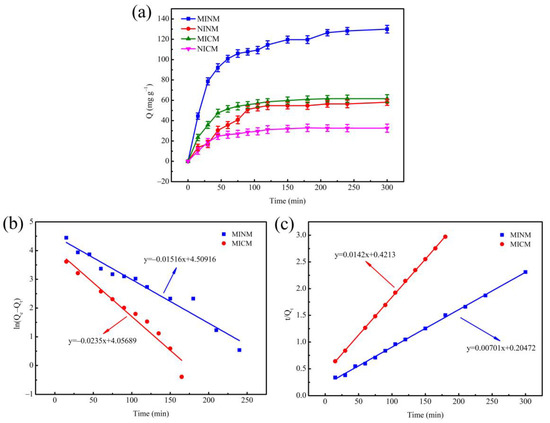 (a) The adsorption kinetics of MINM, NINM, MICM, and NICM; (b) the pseudo-first-order kinetic model of MINM and MICM; (c) the pseudo-second-order kinetic model of MINM and MICM.