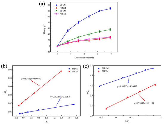 (a) The adsorption isotherms of MINM, NINM, MICM, and NICM; (b) the Langmuir isotherm model of MINM and MICM; (c) the Freundlich isotherm model of MINM and MICM.
