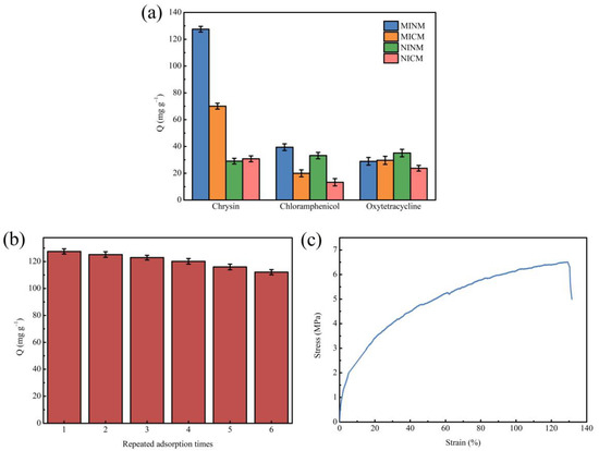(a)The selective adsorption capacity of MINM, MICM, NINM, and NICM; (b) regeneration rebinding performance of MINM; (c) stress–strain curve of MINM.