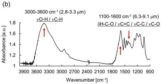 As shown in the FT-IR spectrum of lignin used in this study (Figure 1b), there are two main bands in the near- and mid-infrared regions [32,33]. The near-infrared band from 3000 cm−1 (3.3 μm) to 3600 cm−1 (2.8 μm) contains a major O-H stretching mode (νO-H) and a minor C-H stretching mode (νC-H) as a shoulder band. The mid-infrared region at 1100–1600 cm−1 (6.3–9.1 μm) contains a C-H bending mode (δC-H), aliphatic C-C stretching (νC-C) and aromatic C=C stretching (νC=C) modes, and a C-O stretching mode (νC-O). The IR-FEL was tuned to 2.9 μm (3448 cm−1), 6.3 μm (1587 cm−1), and 7.1 μm (1408 cm−1), and these laser beams were introduced onto the lignin powder (about 5 mg) in a glass tube from the vertical direction for 10 to 15 min at room temperature (see Figure S1 for the beam spectrum at each wavelength). The glass tube was sometimes shaken horizontally to give the radiation energy to the whole sample uniformly (see Figure S2 for the experimental setup). After irradiation, the structural change of the lignin sample was analyzed as described below.