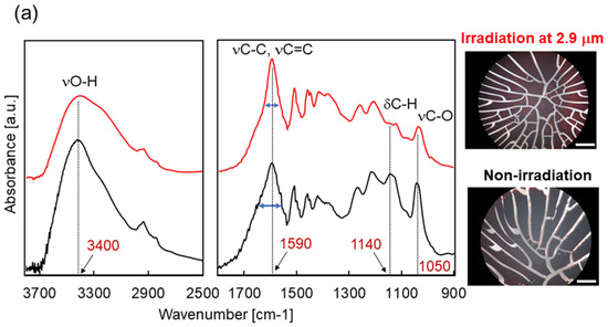 First, we show an irradiation effect of the IR-FEL tuned to 2.9 μm (Figure 2). In the optical microscopy image (Figure 2a, right panel), there are several cracks on the surface of dry lignin, the size of the crack was smaller, and the number was more greatly increased after irradiation than before irradiation. The black color of the surface was slightly decolorized to brown. These morphological changes indicate that the infrared laser irradiation caused some physical damage to the structure of the lignin. In the SR-IRM spectra (Figure 2a, left and middle panels), the broad band around 3400 cm−1 (νO-H) was substantially decreased (left panel) and two strong peaks at about 1140 cm−1 (aromatic C-H deformation vibration) and 1050 cm−1 (C-O stretch vibration) were decreased (middle panel) after the irradiation (red) compared to the original lignin (black). In addition, the half width of the strong peak at about 1590 cm−1 (which covers aromatic C=C and aliphatic C-C stretch vibrations) was slightly shortened by the irradiation. Therefore, it seems that some large conformational changes can be induced by vibrational excitation at about 3 μm.