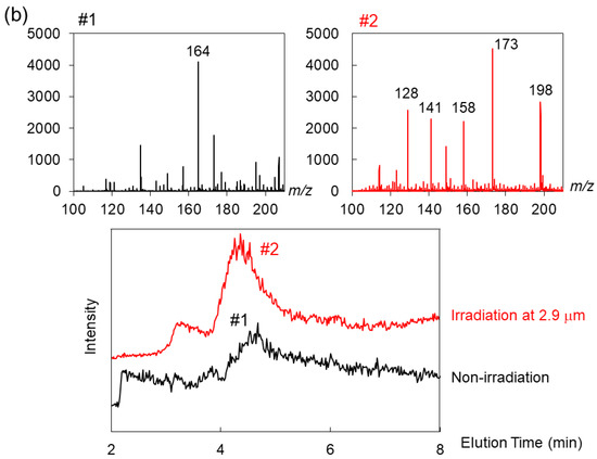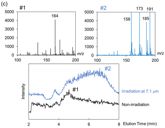 Next, we analyzed the low-molecular weight region below 200 Da in detail (Figure 3c). A mass peak at 164 Da was mainly detected before irradiation (black), and several fragment peaks including 158, 173, 185, and 191 Da were observed after irradiation (blue); 173 may correspond to a sodium ion adduct of coumaryl alcohol (150 Da), 158 is its fragment peak (-15[CH3]), 185 is considered to be a fragment peak from hydrated coniferyl alcohol (198-13[CH]), and 191 could possibly be a sodium ion adduct of vanillic acid (168 Da). In the mass chromatography analysis (below), the volume of the fraction containing these fragment ions after irradiation (#2) was larger and eluted more belatedly than the fraction before irradiation (#1). These results indicate that infrared laser irradiation at 7.1 μm induced remarkable fragmentation of the main chain of lignin, and it is interesting that vanillic acid appeared after irradiation.