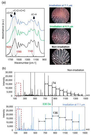Second, we looked at the irradiation effects of IR-FEL tuned to 6.3 μm and 7.1 μm (Figure 3). In the optical microscopy image (Figure 3a, right), the number of cracks increased and the color of the surface of lignin was changed from black to reddish brown after these irradiations (upper and middle) compared to before irradiation (bottom). In particular, the morphological change caused by irradiation at 7.1 μm (upper) was more remarkable than with irradiation at 6.3 μm (middle). SR-IRM analysis (left) showed that a strong band around 1590 cm−1 was largely decreased, accompanied by an increase in the shoulder band at a higher wavenumber, and a middle peak at 1130–1145 cm−1 was slightly decreased after 7.1 μm irradiation (blue) compared to the original lignin (black). The shoulder band around 1635 cm−1 contains C=O stretching vibrational mode, and the appearance of this shoulder is quite different from the effect of 2.9 μm irradiation (Figure 2a, red). Interestingly, the spectral pattern was not changed much in the case of irradiation at 6.3 μm (green), which may imply that the structural alteration was minor compared to that in the case of 7.1 μm. Thus, we investigated the effect of irradiation at 7.1 μm in detail as described below.