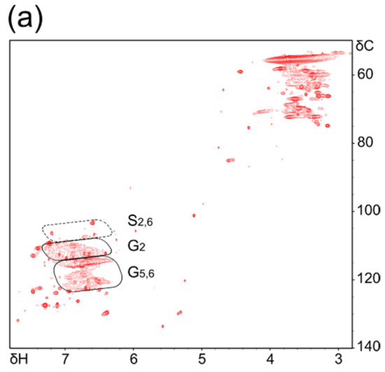 The lignin sample (ca. 50 mg) was dissolved thoroughly in DMSO-d6 (600 μL) by ultrasound sonication. NMR spectra were recorded at 298 K on a Bruker AVANCE III HD 600 spectrometer (Bruker Corporation., Yokohama, Japan) equipped with a cryogenic probe and Z gradient (Bruker Biospin). The instrument was controlled using Bruker TopSpin 3.5. The two-dimensional (2D) 13C-1H heteronuclear single-quantum coherence (13C-1H HSQC) spectra were acquired using the Bruker pulse sequence ‘hsqcetgpsisp2.2’ with the following parameters: number of scans (NS), 128; spectral width (SWH), 7212 Hz (1H) and 22645 Hz (13C); acquisition time (AQ), 142 ms (1H) and 11 ms (13C). The 13C-1H 2D heteronuclear multiple bond correlation (HMBC) spectra were acquired using the Bruker pulse sequence “hmbcetgpl3nd” with the following parameters: number of scans (NS), 128; spectral width (SWH), 7212 Hz (1H) and 33213 Hz (13C); acquisition time (AQ), 284 ms (1H) and 7.7 ms (13C). All the chemical shifts were referenced to the DMSO-d6 solvent peak (δC = 39.5 ppm and δH = 2.49 ppm). NMR data were processed and analyzed with TopSpin 3.5 and Sparky [35], respectively.