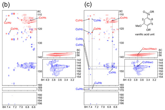 The 2D 13C-1H HSQC and 2D 13C-1H HMBC spectra of the sample after irradiation at 7.1 μm are superimposed in Figure 4c. The signals of the 2D 13C-1H HSQC spectrum (red) at (δC/δH) = (113.1/7.45), (114.2/6.70), (122.6/7.35), and (55.5/3.74) turned out to belong to the C2/H2, C5/H5, C6/H6, and CMeO/HMeO of the vanillic acid unit, respectively. Additionally, the signals of the 2D 13C-1H HMBC spectrum (blue) at (δC/δH) = (113.0/7.35), (146.5/7.44), (146.5/3.74), (148.4/7.44), (148.4/6.70), (122.7/7.45), (169.7/7.35), and (169.7/7.44) were found to be the correlation signals for the C2/H6, C3/H2, C3/HMeO, C4/H2, C4/H5, C6/H2, Cα/H6, and Cα/H2 of the vanillic acid unit, respectively. These chemical shift values were similar to, if not the same as, those reported previously [36]. We noticed that there are signals that probably belong to the C2/H2, C5/H5, and C6/H6 of the vanillic acid unit in the 2D 13C-1H HSQC spectrum of the sample before irradiation (Figure 4b, red). However, the intensities of these signals were weak, indicating that the amount of the vanillic acid unit in the sample before irradiation was low. Since the intensities of the signals of the vanillic acid unit in the sample after the irradiation were strong, the amount of the vanillic acid unit seems to be increased by IR-FEL irradiation.