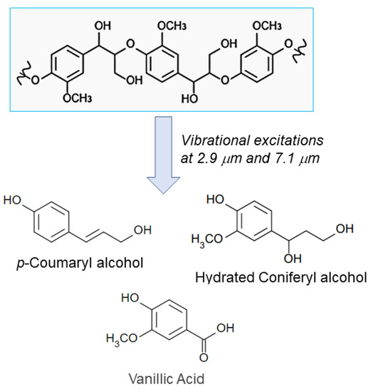 Degradation of lignin by vibrational excitation at 2.9 μm and 7.1 μm. Three lignin monomers were identified by the ESI-MS and 2D NMR analyses after the IR-FEL irradiations.