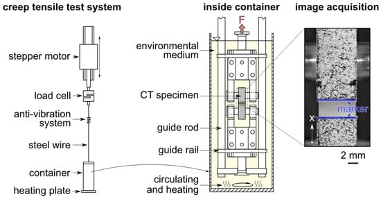 Static load experimental tests are performed on an electronically controlled tensile creep test system from IPT (Institut für Prüftechnik Gerätebau, Todtenweis, Germany), Figure 3. Constant force was applied by a linear stepping motor and determined by a 500 N load cell. The specimen was immersed in a temperature controlled medium container in the clamped configuration. It was positioned precisely to determine crack opening displacement (COD(t) in Figure 2) by the optical measurement method through a quartz glass window in the medium container. The specimen clamping connection with the load cell or stepping motor was established by a steel wire. To limit the degrees of freedom of the clamping, i.e., to avoid a strong deformation by twisting of the immersed specimen under load, both the upper and lower specimen clamping was supported by a guide rail for linear displacement in the direction of load.