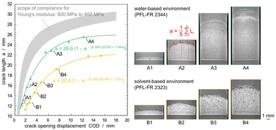 where , , and are empirical constants where can be related to the final crack length before ductile failure. To evaluate the measurements and to apply the fit in Figure 4, Equation (6) is used. The following values are obtained for PFL-FR 2344: , , and . The corresponding values for the solvent-based PFL-FR 2323 are , , and . Both fit functions are plotted in Figure 4. In the following calculations of this study, the calibration derived using PFL-FR 2344 as environment according to Equation (6) is used for all water-based environmental media (distilled water and 2 wt% aq. Arkopal N100), since no significant changes of material properties are expected. The plasticizing characteristic of solvents requires an additional calibration in order to determine experimental values for the studies with PFL-FR 2323.
