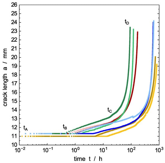 In the initial time interval no crack growth could be detected, as shown in Figure 5. It should be noted that crack length starts by definition at at=0 = 11 mm, Figure 2, and although a ΔCOD is detected, there is not yet any crack propagation in the initial stages. This agrees with the empirical calibration depicted in Figure 4. The time where the creep crack growth starts is referred to as initiation time. This delayed phenomenon is assumed to be connected to the microplastic flow and orientation of the amorphous phase inducing nucleation of micro-voids changing the microstructure at the base of the deformation zone (craze) upon specimen loading before the actual crack propagation []. It is expected that, with increasing time, crazes with elongated fibrils develop from the voids in the time interval , which, however, are not defined as a crack until is reached. Despite the difficulties in precisely determining the time when crack growth starts, is about one order of magnitude longer for the PE-HD plasticized by PFL-FR 2323 compared to the water-based surface-active environments. observed within distilled water does not allow a significant assignment; however, it is expected that associates to longer times than is the case within the surface-active media.